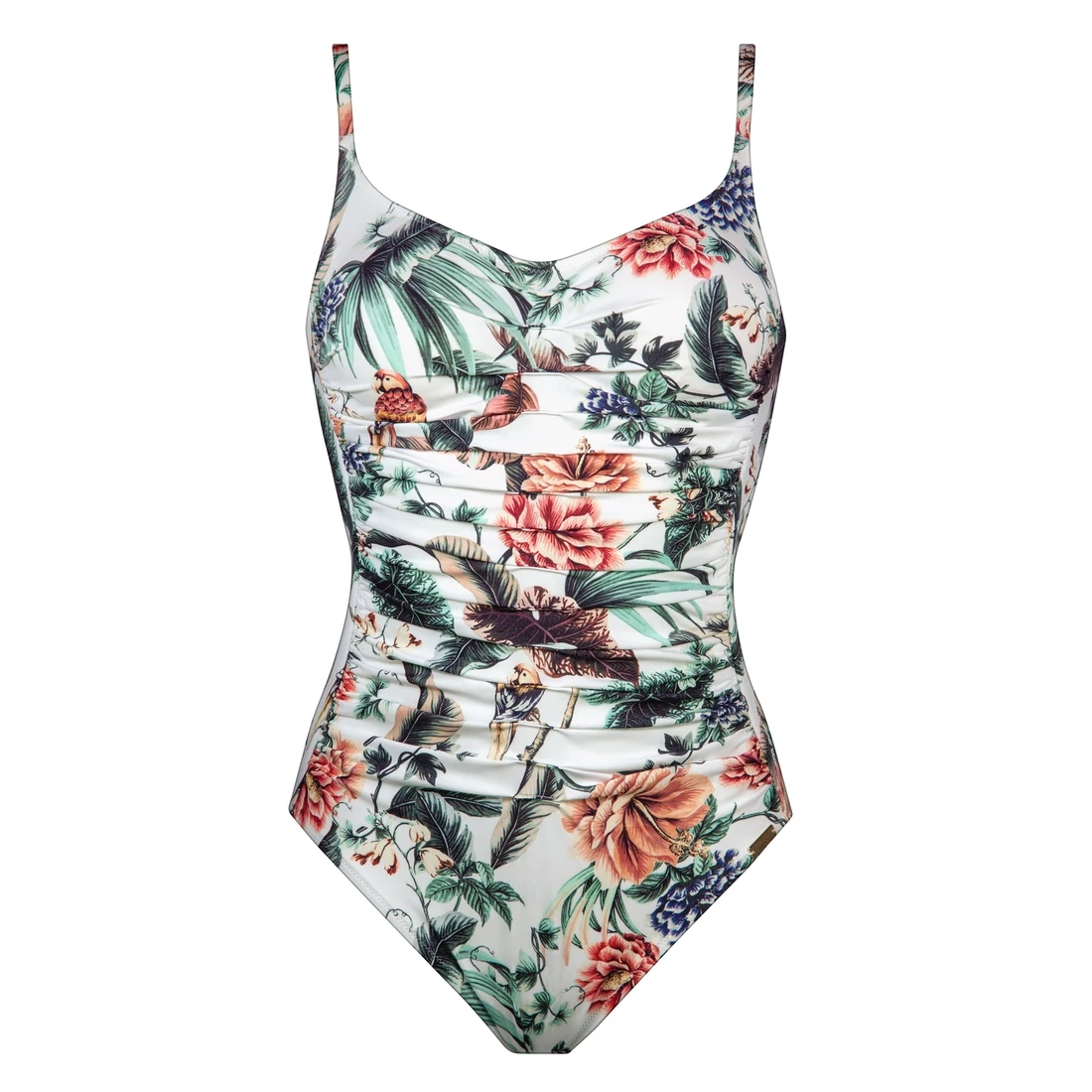 Avec son tissu parfaitement technique, le maintien de la poitrine est optimal. Les armatures permettent le bon maintien même pour les poitrines plus volumineuses. Le plissé sur le ventre donne un effet gainant et amincissant.